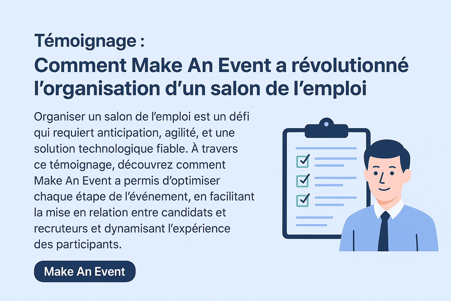 Organiser un salon de l’emploi est un défi qui requiert anticipation, agilité et une solution technologique fiable. À travers ce témoignage, découvrez comment Make An Event a permis d’optimiser chaque étape d’événements organisés aussi bien par des universités que par des start-ups spécialisées dans l’emploi, en facilitant la mise en relation entre candidats et recruteurs […]